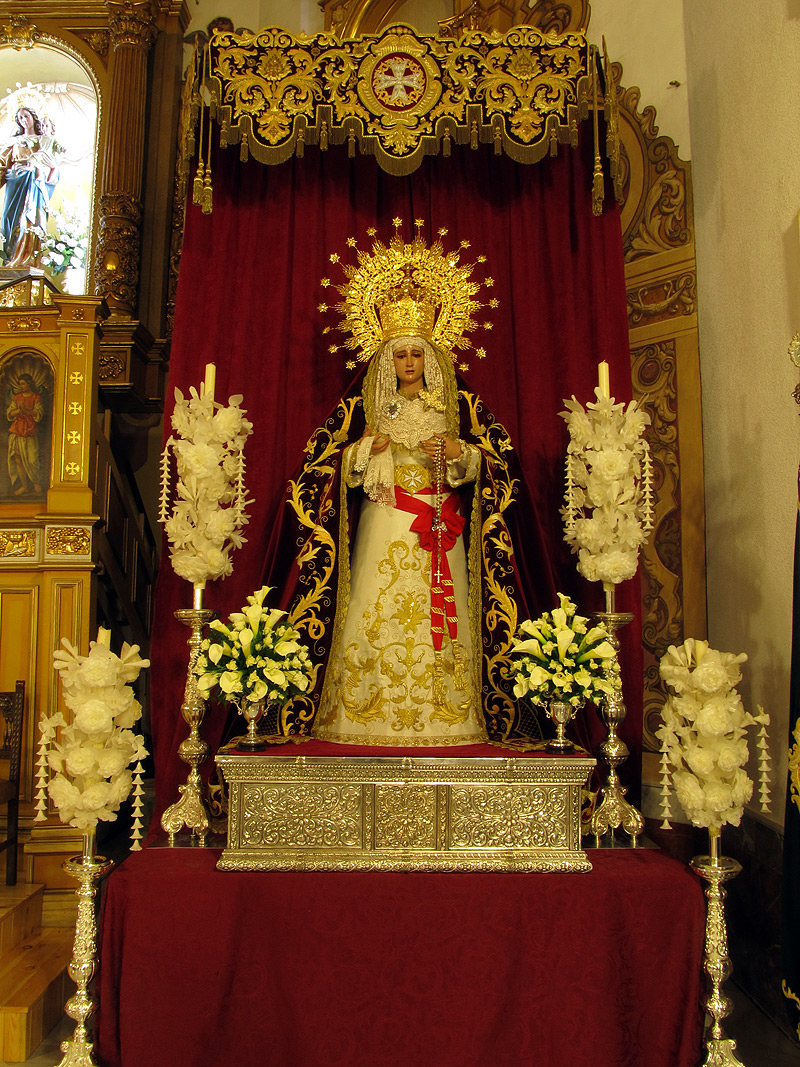 El altar de la iglesia del colegio salesiano se mostraba desde la noche anterior tal y como muestran las imágenes. La arquitectura efímera es otro proyecto de Alejo Molina García, auxiliar del paso del Stmo. Cristo del Perdón, y encargado de la priostía en los últimos años. Excelente labor que podemos apreciar en esta misma página gracias a las instantáneas compartidas por José Ángel Jiménez García.